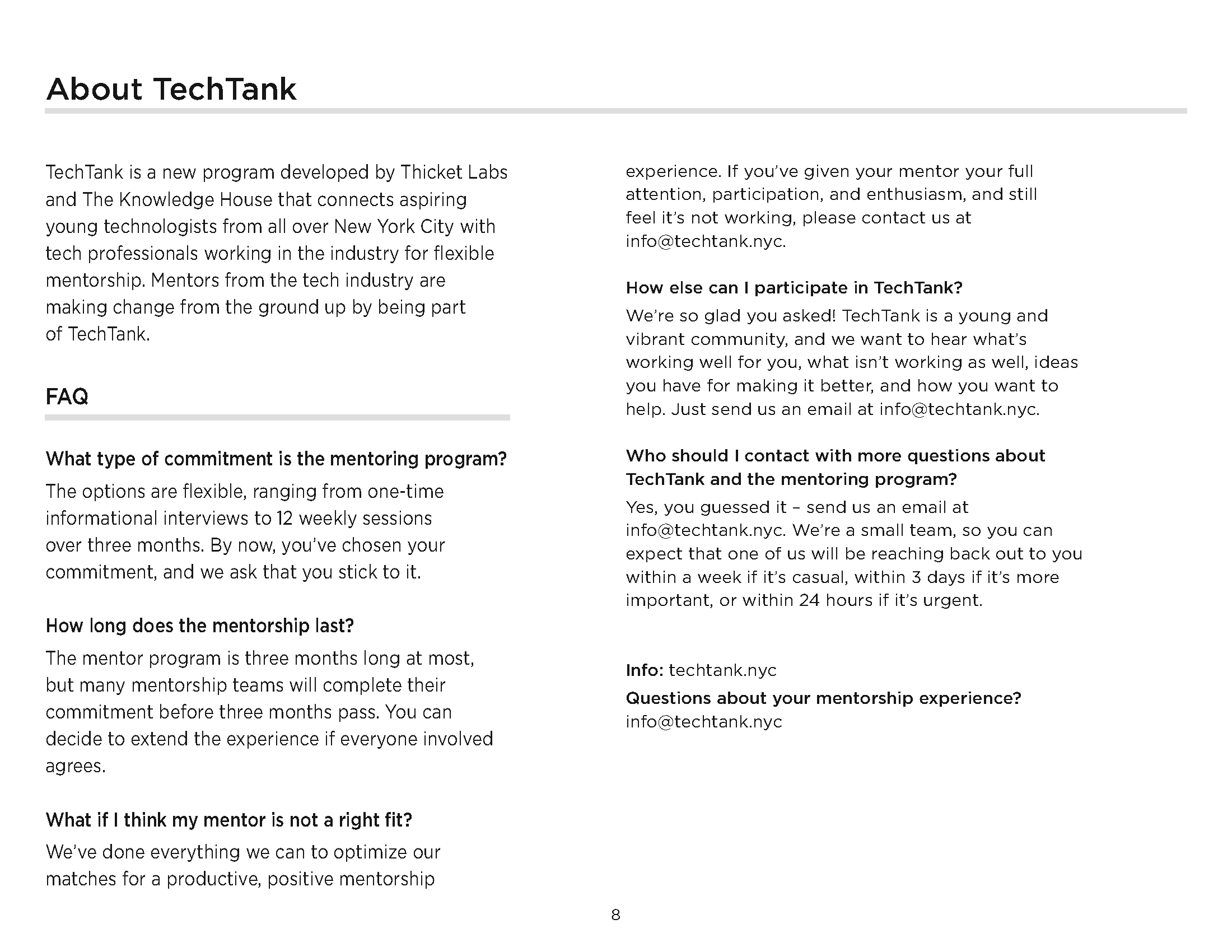 TechTank was launched as a technology-powered mentor matching platform and networking event that matched NYC’s technology students with experienced professionals in the tech industry and kicked off a three-month mentorship program. This program not only offered a variety of engagement levels—ranging from single informational interviews to intensive three-month mentorships—but also focused on soft skills, cultural fit, and diversity within tech hiring practices.